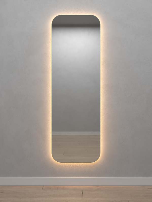 Безрамное зеркало прямоугольной формы с контурной (тыльной) тёплой подсветкой, свет 3000К. Подложка из высококачественного МДФ, светодиодная лента защищена матовым свето-рассеивателем от попадания пыли и влаги. Есть вывод 220W для подключения к сети, включение подсветки от выключателя на стене, либо от розетки.