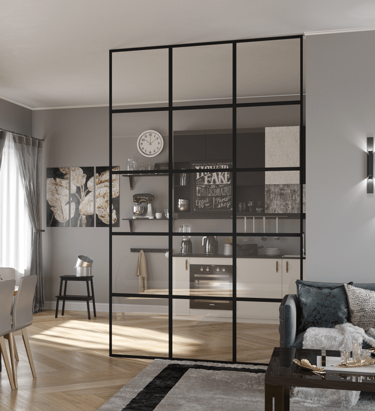 Стильно смотрится прямоугольная перегородка, разделенная на одинаковые квадратные блоки, внутри которых надежно зафиксировано закаленное многослойное стекло – триплекс.